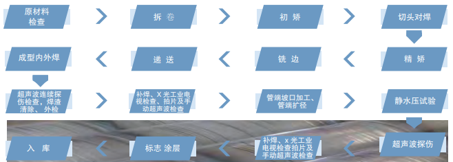 原材料開卷—平整—端部剪切及焊接—活套—成形—焊接—內(nèi)外焊珠去除—預校正—感應熱處理—定徑及校直—渦流檢測—切斷—水壓檢查—酸洗—最終檢查(嚴格把關)—包裝—出貨。